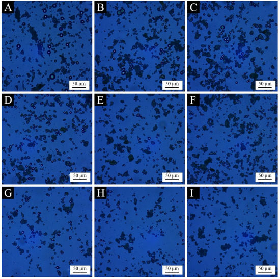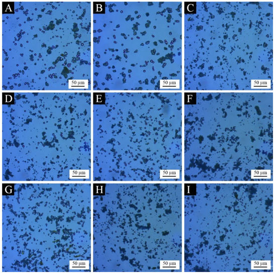 OM images of microcapsules in the single factor experiment: (A) sample 10, (B) sample 11, (C) sample 12, (D) sample 13, (E) sample 14, (F) sample 15, (G) sample 16, (H) sample 17, and (I) sample 18.