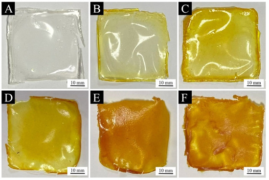 Macro morphology of the paint films: (A) 0% microcapsule-loaded film, (B) 1.0% microcapsule-loaded film, (C) 3.0% microcapsule loaded-film, (D) 6.0% microcapsule-loaded film, (E) 9.0% microcapsule-loaded film, and (F) 12.0% microcapsule-loaded film.