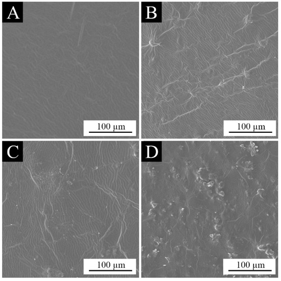 SEM images of the paint films: (A) 0% microcapsule-loaded film, (B) 3.0% microcapsule-loaded film, (C) 6.0% microcapsule-loaded film and (D) 12.0% microcapsule-loaded film.