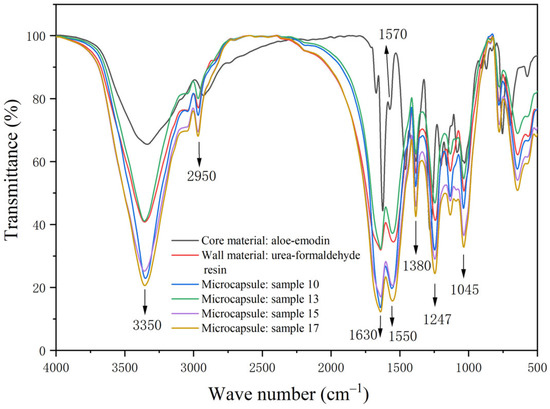 Figure 9 illustrates the absorption spectrogram of the aloe-emodin, the urea-formaldehyde resin, and the microcapsules. The peaks at 3350 cm−1, 2950 cm−1, and 1630 cm−1 are the stretching vibration peaks of O-H, the bending vibration peak of C-H, and the stretching vibration peak of C=O. These characteristic peaks were jointly possessed by the aloe-emodin and urea-formaldehyde resin and can also be clearly seen in the absorption curve of microcapsules. The peak at 1550 cm−1 is the characteristic peak of C-N in the urea-formaldehyde resin, and the peak at 1247 cm−1 was caused by the stretching vibration of C-N and the deformation vibration of N-H in the urea-formaldehyde resin. These were the characteristic peaks of the wall material and the microcapsules, indicating the existence of urea-formaldehyde resin in the microcapsules [36,37]. The peak at 1045 cm−1 is the C-O-C absorption peak of dimethylol urea in the urea-formaldehyde resin. The specific C=C in aloe-emodin appears at 1570 cm−1 [38], and this absorption peak also appears in the absorption curve of microcapsules, which indicated that there was a chemical component of aloe-emodin in the microcapsules. The above characteristic peaks proved that the microcapsules contained core material and wall material, and the chemical composition was not damaged, proving that the microcapsule coating was successful.