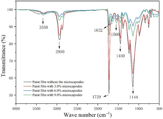 Figure 10 is the absorption spectrogram of the film without microcapsules and the films with microcapsules. The peaks at 3350 cm−1, 2950 cm−1, and 1144 cm−1 are the peaks of O-H, C-H, and C-O that were found in the water-based coating and the microcapsules. The characteristic peak at 1729 cm−1 belongs to the telescopic vibration peak of C=O in the water-based coating. The expansion vibration peak of (-CH2)-CH2 in the waterborne coating appears at 1450 cm−1. These characteristic peaks can be seen in the four curves, indicating that the chemical composition of the water-based coating was not damaged after mixing with the microcapsules. The 1560 cm−1 peak is characteristic of C=N in the microcapsule wall material, and the peak at 1632 cm−1 is the absorption peak of C=O in the microcapsule core material. These peaks can be seen in the curves of the films loaded with microcapsules, which proved that the chemical composition of the microcapsules in the water-based coating did not change. The existence of these characteristic peaks indicates that after the microcapsules were mixed with the water-based coating, there was no chemical reaction with the coating, and the components of the water-based coating and the microcapsules remained intact and effective.