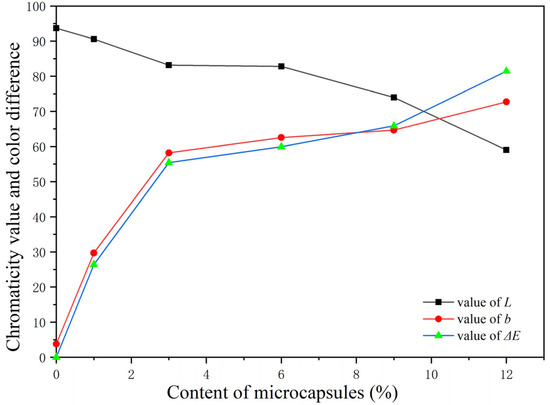 The color difference in the paint films was measured in line with GB/T 11186.3-1989 by a colorimeter [34]. The values of L, a, and b were noted during the test. L represents the brightness value of the paint films. A higher value indicates a brighter color of the paint film. a represents the red-green value of the paint films; a positive number indicates the color is reddish, and a negative number indicates the color is greenish. b refers to the yellow-blue value of the paint films. A positive number indicates the color is yellow, and a negative number indicates the color is blue. The test values of the film without microcapsules are L1, a1, b1, and the test values of the films with microcapsules are L2, a2, b2. The color difference ΔE was obtained by Formula (3). In it, Δa = a2 − a1, ΔL = L2 − L1, Δb = b2 − b1.