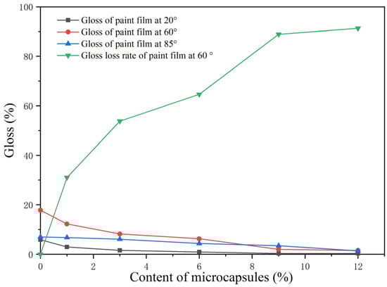 The gloss and gloss loss rates of the paint films are indicated in Table 14 and Figure 15. As the microcapsule loading increased, the gloss gradually decreased, and the gloss loss rate at 60° gradually increased. When the loading reached 12.0%, the gloss was the lowest, and the loss rate was the highest, which was obviously not suitable for practical production applications. This occurred because the granular microcapsules affected the smoothness of the paint films after drying. When the content of microcapsules was high, the paint film surface was rough and the diffuse reflection of light was enhanced, so the gloss was very low.