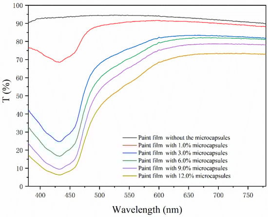 As shown in Figure 16, the transmittance of the paint film was negatively correlated with the loading of the aloe-emodin microcapsules. The higher the loading, the lower the transmittance. This occurred because the microcapsules were yellow and opaque, and adding them to the transparent water-based coating affected the light transmittance. As seen from the curve, in the wavelength range of 400–480 nm, the transmittance of the film with the microcapsules was far lower than that without the microcapsules, and the transmittance reached the lowest value at 430 nm. This occurred because the paint films with microcapsules were yellow, while purple and blue are the complementary colors of yellow. The wavelength range was respectively between 400–450 nm and 450–480 nm. When the visible light passed through the paint films, the purple light and blue light were absorbed, and the remaining light intensity was significantly lower than the incident light intensity, so the transmittance in this wave band was very low.