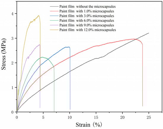The effect of the aloe-emodin microcapsules with different loadings on the tensile resistance of the paint films is shown in Figure 17. It can be seen from the figure that when the loading was less than 6.0%, the paint films had a certain elastic area, which decreased with the increase in the loading. This may be because the microcapsule particles were distributed in the paint film, which reduced the ductility of the water-based paint film itself. When the content reached 9.0% and 12.0%, the tensile area of the paint films decreased rapidly. At this time, the strain of the paint film under high stress was very small, which indicated that the paint film was strong and had low ductility. This phenomenon may have occurred because when the loading of the aloe-emodin microcapsules was too high, a large number of microcapsules were filled in the paint film, which enhanced its hardness and made it more brittle.