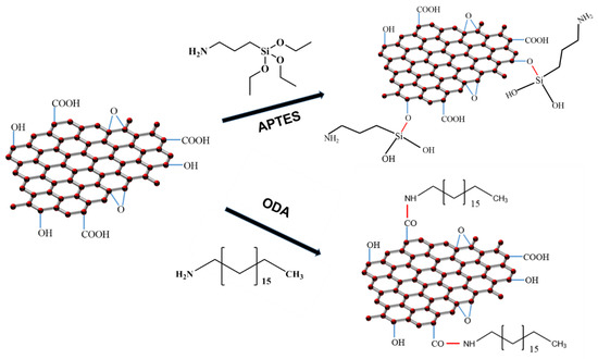 - Abidin, A.S.Z.; Yusoh, K.; Jamari, S.S.; Abdullah, A.H.; Ismail, Z. Surface functionalization of graphene oxide with octadecylamine for improved thermal and mechanical properties in polybutylene succinate nanocomposite. Polym. Bull. 2018, 75, 3499–3522. [Google Scholar] [CrossRef]