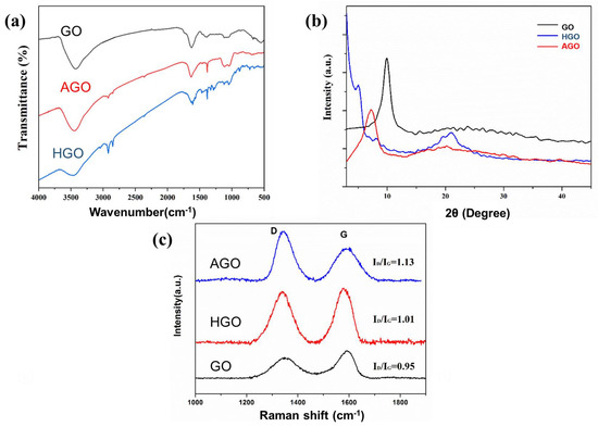 FTIR spectrum (a), Raman spectrum (b), and XRD patterns (c) of GO, AGO, and HGO.