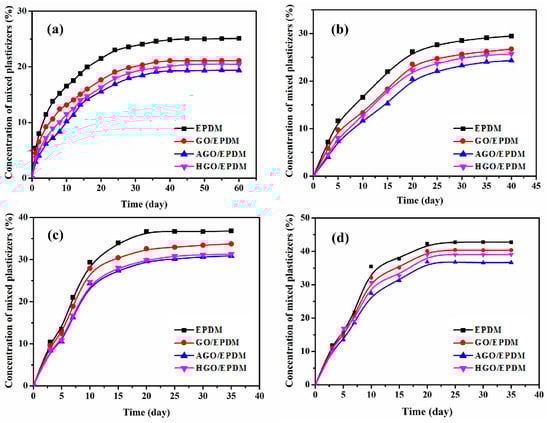 The concentration of mixed plasticizers migrating to EPDM insulations was assessed using the immersion method. The immersion method involves the soaking of the material test piece in the liquid of the absorbed component, removing the test piece regularly for weighing, and calculating the weight gain rate and diffusion coefficient (the limit of migration) at the swelling equilibrium, which reflects the anti-migration performance. NG is unstable at room temperature and tends to explode, so we replaced it with triacetin and ethyl nitrate, which are similar in structure. The mixed plasticizers contains 30% DOS, 30% DBP, 20% triacetin, and 20% ethyl nitrate. The migration concentration curves of mixed plasticizer in EPDM insulations are shown in Figure 5, and Table 1 lists the migration equilibrium concentration. As shown in Figure 5a, the migration equilibrium concentrations of mixed plasticizer in the pure EPDM insulations at 25 °C was only 24.69%. At the same temperature, the migration equilibrium concentrations of mixed plasticizer in the GO/EPDM insulations decreased to 21.26% due to the barrier properties of GO. The equilibrium concentrations continues to decrease with the addition of AGO and HGO, the addition of functionalized GO are useful to increase the difficulty of mixed plasticizer diffusion, which significantly improved the migration equilibrium concentration. The equilibrium concentrations of AGO/EPDM insulation at 25 °C were 20.28%, indicating that the introduction of AGO can enhance the anti-migration performance. AGO/EPDM showed the best migration resistance caused by the silane coupling agent of APTES enhanced the compatibility between AGO and EPDM. In addition, after APTES modification, AGO dispersed more uniformly in EPDM matrix. The migration resistance of HGO/EPDM also shows a certain increase due to the introduction of HGO. This is due to the decrease in polar sites of HGO after modification, and the alkyl chain on the surface of HGO is easy to entangle with an EPDM molecular chain, which improves the interface conditions and blocks the diffusion of plasticizer. Moreover, the increased crosslink density of AGO/EPDM and HGO/EPDM also has an effect on reducing the amount of migration. With the increase in temperature, the equilibrium concentration of mixed plasticizers in the insulation increases, but the trend is consistent with that at 25 °C, and AGO/EPDM and HGO/EPDM maintain the excellent migration resistance of mixed plasticizers at a high temperature.
