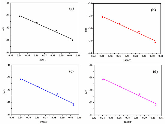 Linear fit of the activation energy in different insulation. (a) EPDM, (b) GO/EPDM, (c) HGO/EPDM, and (d) HGO/EPDM.