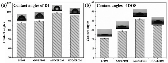 The affinity between the surface of the EPDM insulation and the plasticizer was directly tested by the contact angle to further indicate that the introduction of functional GO was beneficial to prevent the migration of plasticizer. To reduce the measurement error, when measuring the contact angle of the samples, three different points were taken, and the final result was averaged. Figure 8 was the contact angle of the insulation. The test liquid was DI and DOS. It can be seen from Figure 8a that the water contact angles of EPDM and GO/EPDM were 87° and 90°, respectively, and the water contact angle change is not obvious. The water contact angles of AGO/EPDM and HGO/EPDM increased to 99° and 96°, respectively, and hydrophobicity was improved. DOS was used as a test liquid to explore the affinity between the EPDM insulation surface and DOS. The DOS contact angle of EPDM was 21°, and the DOS contact angles of GOEPDM, AGO/EPDM, and HGO/EPDM were increased to 29°, 42°, and 35°, respectively. The reason for the improvement of AGO/EPDM performance is that the amino group is introduced on the surface, which reduced affinity with DOS, so it is also beneficial to preventing plasticizer diffusion. The introduction of HGO causes the surface of GO to create long, fat chains, which is also beneficial for decreasing affinity with DOS and preventing plasticizer migration.