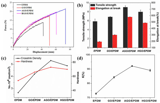 The crosslink density and hardness of the insulation are shown in Figure 9c. Crosslink density is an important characteristic of polymers, exerting an essential influence on the comprehensive performance. It is obvious that the change trend of tensile properties is consistent with that of crosslinking density. Figure 9c exhibits the hardness of the insulations. It can be seen that the introduction of GO, AGO, and HGO improve the hardness. The maximum value of hardness of AGO/EPDM can reach 71°, while the value of EPDM is only 54°. The introduced AGO is uniformly dispersed in the matrix, which is the main reason that the hardness of the insulation materials is enhanced; meanwhile, the silane coupling APTES improves the compatibility between AGO and EPDM. As for HGO/EPDM insulation, the hardness is also improved, and the long alkane chain of ODA has better compatibility with the polymer and improves the compatibility of HGO with EPDM.