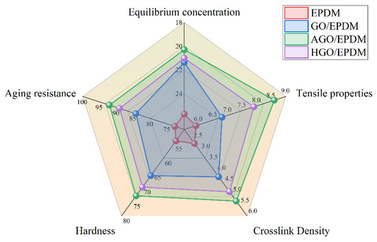 As shown in Figure 10, the polygon area can be used to evaluate the comprehensive properties of different insulations, including equilibrium concentration, tensile properties, aging resistance, hardness, and crosslink density. The comprehensive performance of EPDM insulation is the worst, and the corresponding polygon area is the smallest. After the addition of functionalized GO, the performance is greatly improved, and the area of the polygon becomes larger. AGO/EPDM has the largest area, the best comprehensive performance, and excellent tensile strength, crosslink density, hardness, and aging resistance. The results show that functionalized GO is a candidate material for the enhancement of the comprehensive performance of EPDM insulation.