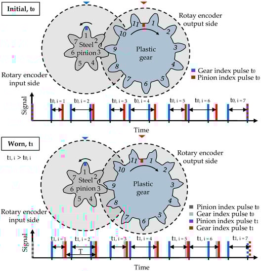 In order to measure the tooth flank wear and elastic tooth deflection of the plastic gear on the output side, the index pulses of the rotary encoders on the input and output shaft are evaluated. With progressing wear and deformation, the index pulse of the gear delays. Thus, the timing difference between the input and output index pulses increases (t0 < t1) as shown in Figure 2.