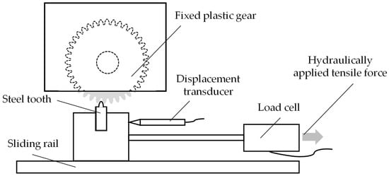 The used pulsator test rig by LUVRA Hydraulik und Regeltechnik GmbH, Nuremberg, Germany, consists of a steel tooth which is mounted on a sliding rail. The steel tooth is hydraulically pressed against a fixed polymer tooth. The horizontal movement of the plastic gear’s tooth due to the hydraulic force is measured by a displacement transducer. The pulsator test rig with its main components is shown schematically in Figure 4.