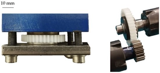Sosa et al. [17] use a tactile profile measurement sensor for analyzing the tooth contour in situ. Limitations of this approach are that the test run has to be stopped for measuring and the plastic gears have to be big enough for the measuring tip to reach the relevant areas of the tooth flank. The concept of Yousef et al. [18] is based on the gravimetric measurement of the plastic gear, assuming that the gear weight decreases proportionally to the gear wear. However, this approach is only applicable if the wear debris completely leaves the system. The experimental setup of Hooke et al. [19] consists of a gear pairing, which is mounted on a rotatable block. The block is loaded with a weight on a loading arm. The construction is balanced during operation but rotates downwards with progressing wear. The main limitation of this concept is that wear and elastic deformation cannot be measured separately.