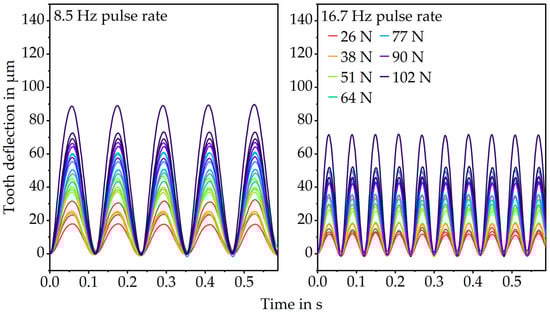 As expected, the results of the pulsator tests show increasing elastic deformations with increasing loads, shown in Figure 6. The tooth deflection returns to zero when the load is removed for each load level. At the high pulse rate of 16.7 Hz, the deformations tend to be lower which is supported by the correlation between higher loading speeds and stiffer material behavior described in the literature [2].