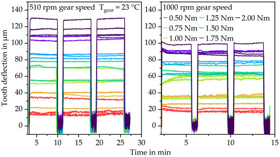 For the isothermal gear test runs, the high loading torque was applied for 200 load cycles and the low measuring torque for 40 load cycles. The test duration was set at three load changes. This results in a test duration of approximately 30 min at 510 rpm gear speed and 15 min at 1000 rpm gear speed. Different speed–load combinations have been investigated, which are typically relevant for gear applications. The low measuring torque was set at 0.2 Nm which is as low as possible without risking that the gears lose contact. The high loading torque was set at 0.50 Nm, 0.75 Nm, 1.00 Nm, 1.25 Nm, 1.50 Nm, 1.75 Nm and 2.00 Nm. Higher loads lead to early plastic deformations and gear failure and thus have not been investigated. The elastic tooth deflection was evaluated as the difference of the average deformation at the high torque and the average deformation at the low torque. The elastic tooth deflection only differs marginally between the first load change and the following two changes. Moreover, the plastic gear begins to wear during operation which would lead to incomparable test conditions. Consequently, only the first load change was evaluated in terms of the elastic tooth deflection for the correlation between the gear test rig and pulsator test rig.
