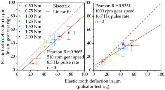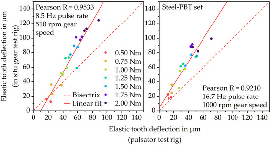 Figure 8 shows the correlation between the elastic tooth deflection measured via the pulsator and in situ gear test rig at 8.5 Hz or 510 rpm (left) and 16.7 Hz or 1000 rpm (right). At 8.5 Hz and 16.7 Hz, the results show a linear increase in elastic deformation with increasing load. This indicates that both measurement principles are qualified for measuring the linear–elastic deformation behavior of plastic parts. At 8.5 Hz, the Pearson correlation coefficient of 0.9533 proves a very good correlation between the gear test rig and pulsator test rig results. At 16.7 Hz, the correlation coefficient 0.9210 is quite similar and also shows a very good correlation. However, at both frequencies, the values measured via the in situ gear test rig are higher than the values measured via the pulsator test rig. Due to the fact that during the gear test runs, a remaining measuring torque of 0.2 Nm is applied and possible load-sharing effects occur, the in situ measured elastic deformation is rather expected to be lower than the pulsator measured elastic deformation.