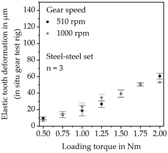 Thus, there is the suspicion that the test rig setup creates an offset measuring the elastic tooth deflection. This might be due to slight angular displacements of the components (e.g., shafts and fixations) within the setup during the test run. To verify this hypothesis and to quantify the offset, gear tests were performed using a steel gear instead of a PBT gear. Since the elastic modulus of steel is considerably higher, the investigated loads will not lead to tooth deflections. Hence, any deformation measured at the hardened 16MnCr5 gear is a measurement offset of the test rig setup. The gear tests with the steel-steel gear set were performed under grease lubrication. The steel gears were mounted within the experimental setup identically to the PBT gears. Figure 9 shows the results.