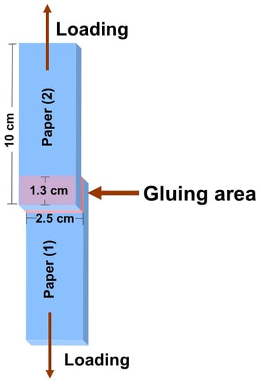For each test, two pieces of paperboard were cut to a width of 2.5 cm and a length of 10 cm. The adhesive application area (2.5 cm × 1.3 cm) was positioned at the end of each piece (see Figure 1). A painting brush (No. 7) was used to apply 40 g of each water-based glue to the gluing area, where the paperboard widths were overlapped. The paperboard adhesive was then allowed to dry at room temperature. A universal testing machine was used to measure the adhesive’s shear strength (INSTRON 5965 Norwood, MA, USA; 5 kN max capacity), followed by a modification of the ASTM D1002 method with a tension mode and a crosshead speed of 5 mm/min [].