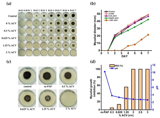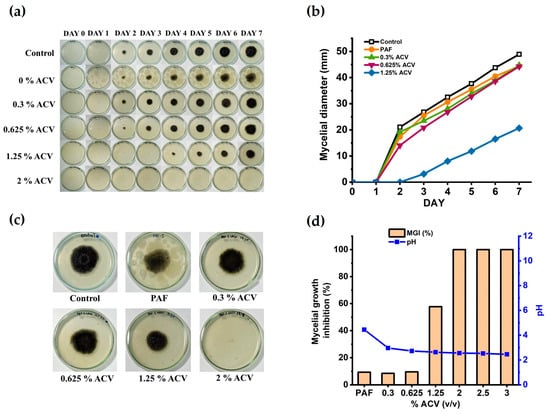 The mycelial growth of A. niger on the m-PAF and ACV/m-PAF adhesives in agar media was monitored for seven days. (a) Photos of the mycelial growth during the seven days of storage; (b) the diameter (mm) of fungal growth on days 0–7; (c) the mycelial growth after seven days of storage; (d) mycelial growth inhibition (%) at varying ACV concentrations.