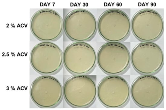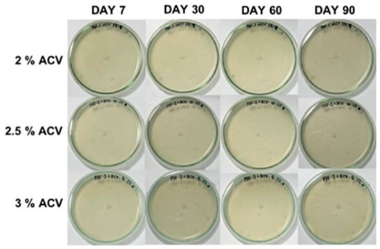 The fungal growth in the adhesives derived from the PAF or ACV/PAF mixtures at various ACV concentrations after 7, 30, 60, and 90 days of storage.