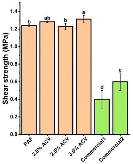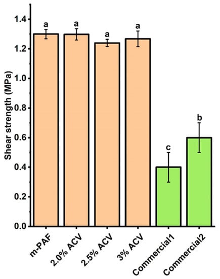 Shear strengths of the m-PAF and ACV/m-PAF adhesives at various ACV concentrations. Group classification (a, b, and c) was given to the data based on the statistical analysis results (significant difference; p ≤ 0.05). Green bar graphs are given for the results from commercially available water glues.