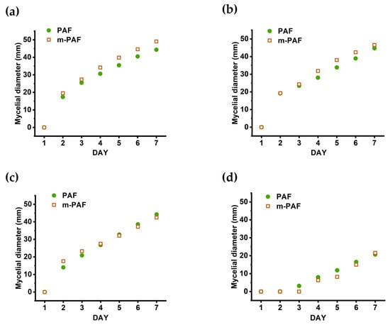 Comparative growth of A. niger in PAF and m-PAF mixed with ACV (a) 0% v/v; (b) 0.3% v/v; (c) 0.625% v/v; (d) 1.25% v/v.