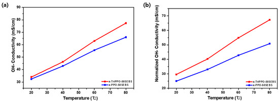| Membrane | IEC (meq/g) | OH− Conductivity (mS/cm) | Water Uptake (%) | Swelling Ratio (%) | Tensile Strength (MPa) | Elongation at Break (%) | Gel Fraction (%) | ||||||