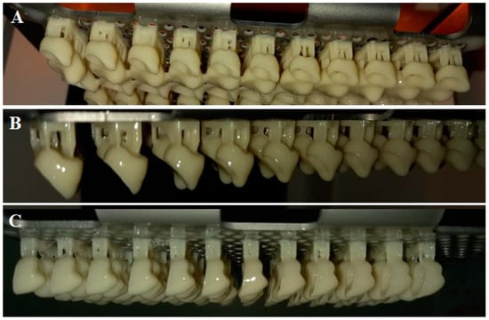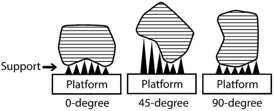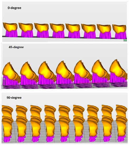 In Reymus’s study [], different orientations were used, with the long axis positioned either occlusal, buccal, or distal to the printer’s platform. Occlusal and buccal orientations are the same as the 0 and 90° orientations, respectively, in the present study. The third orientation was distal, with the specimens printed vertically from the distal surface of the molar to the mesial surface of the molar. This orientation made the printing layer direction parallel to the load direction []. Additionally, the removal of supporting structures at the distal surface of the molar may affect the contact between the first and second molars. Therefore, the 90° orientation was replaced by the 45° orientation.
