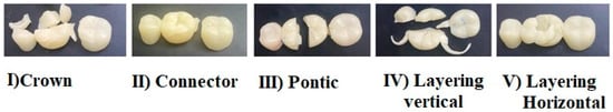 - Park, S.M.; Park, J.M.; Kim, S.K.; Heo, S.J.; Koak, J.Y. Comparison of flexural strength of three-dimensional printed three-unit provisional fixed dental prostheses according to build directions. J. Kor. Dent. Sci. 2019, 12, 13–19. [Google Scholar]