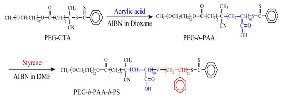 Figure 2. Synthesis of PEG-PAA-PS block copolymer via RAFT-controlled radical polymerization.