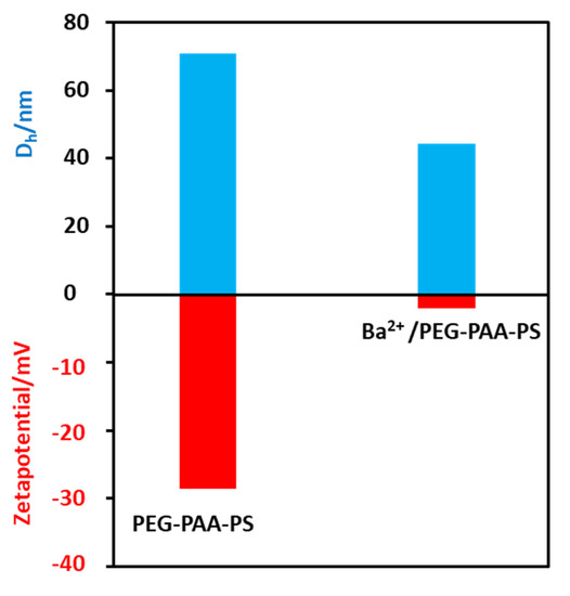The polymer was first dissolved in THF and collected in water by dialysis. The exchange of THF with water makes the solution slightly turbid, indicating the formation of micelles. The Tyndall effects on the polymer solution confirm to the formation of colloidal nanoaggregates (Figure S4). The dynamic light scattering experiment shows that the hydrodynamic diameter (Dh) of the micelles is 74 nm (Figure 3). The zeta potential of the polymer solution at pH 9 is −28 mV. We believe that the polyacrylic acid chains exhibit fully extended conformation as the solution pH is higher than the pKa (4.5) value of acrylic acid [32]. The advantage of these micelles (negatively charged) is that the positively charged metal ions strongly bind electrostatically. The addition of Ba2+ ions turns the solution slightly more turbid, indicating an increased hydrophobicity of Ba2+/PEG-PAA-PS nanoaggregates (Figure S4). The Dh of Ba2+/PEG-PAA-PS decreases to 43 nm, suggesting a decrease in electrostatic repulsion among PAA units due to the neutralization of the negative charge of PAA with Ba2+ ions. The increase in the zeta potential from −28 mV to −3 mV after the addition of metal ions further confirms the masking of the negative charge of micelles by positively charged metal ions. The block copolymer is expected to form uniform spherical micelles in an aqueous solution with the PEG corona, PAA shell, and PS core. After staining with phosphotungstic acid, nanoaggregates were observed by TEM, and spherical micelles were obtained. This provides concrete evidence of the formation of micelles in water. The white sphere indicates a negatively stained PS core (Figure 4a). The micelles’ size (30 nm) from TEM is much smaller than that from DLS (74 nm). This discrepancy is due to the different modes of measurement. DLS is a solution-based measurement. The water around the micelles helps to expand their size. The hydrophilic parts (PEG and deprotonated PAA) have a fully extended form. However, TEM measurement is performed in dry and high vacuum conditions. The micelles are dry and shrunken, which makes the size obtained from TEM always smaller than that of DLS.