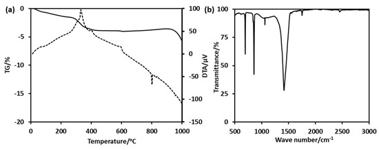 Figure 5. (a) Thermogravimetric analysis (TGA) results of BaCO3/PEG-PAA-PS nanocomposites and (b) Fourier transform infrared (FTIR) spectrum of hollow BaCO3 nanoparticles.