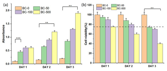 Figure 6. (a) Cytotoxicity graph and (b) cell viability graph of the BC-NPs with the 3T3 fibroblast cells (n = 3), where ** represents p < 0.01 and *** represents p < 0.001.