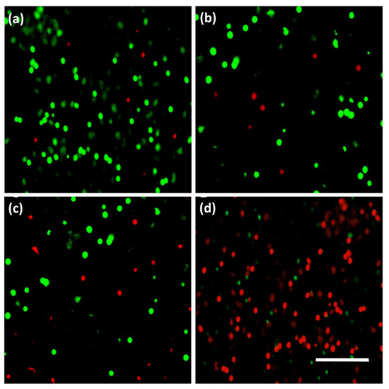 Figure 7. Fluorescence image showing live (green) and dead (red) cells of 3T3 fibroblast cells after exposure to different concentrations of BC-NPs at day 3. BC-0 (a), BC-50 (b), BC-100 (c), and BC-500 (d). All images were taken at 20× magnification. The scale bar is 100 µm.