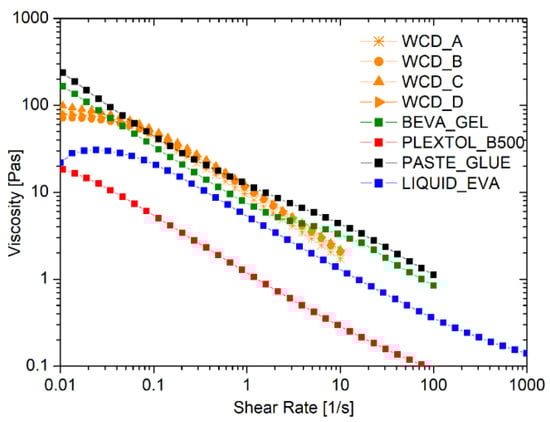 The rheological flow curves of the liquid commercial adhesives, compared to those obtained by the foamed EVA produced by four different WCDs, are shown in Figure 2. As expected, all of the behaviors observed were pseudoplastic, with a marked reduction in the viscosity as the shear rate applied increased. Moreover, no differences were detected in the rheological behavior of the foamed EVA samples produced by different WCD brands, which were proven to have no influence in the foam production process.
