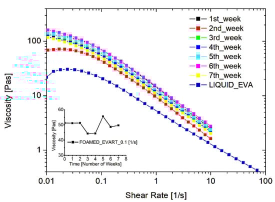 The stability of the system, and the durability of the WCD filled with the EVA liquid emulsion and loaded with the foaming agent, were also inspected. To this aim, one dispenser was prepared at time zero and a foamed sample was produced: the rheological behavior was tested every week for 3 months, while keeping the EVA dispersion within the dispenser and storing it in environmental conditions, simulating a long shelf-life or an occasional use of the product. Figure 3 reports the resulting flow curves obtained at different times. As one can see, the rheological behavior remains constant over time. This is an important result since the durability of the foam is crucial both from an economical and an environmental point of view, and such a finding indicates the possibility of using the entire dispenser prepared, avoiding wastes of the product.