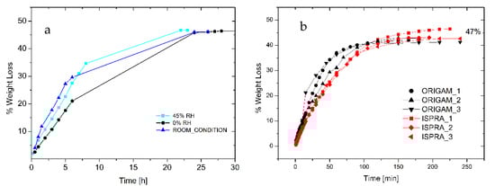 The analysis of the drying time provided the kinetics of water evaporation from either an adhesive thick layer or from a relevant support. Figure 4a shows the drying curve of a 1.2 cm thick layer of foam deposited onto a Petri dish, and it is noteworthy that the complete removal of the solvent (about 47 wt.%) that occurred within 24 h was not significantly affected by the environmental relative humidity.