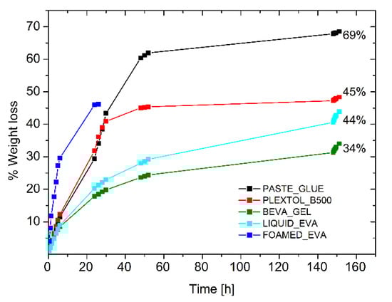 The drying behavior of the other commercial glues (Beva Gel, Plextol B500, glue paste, and Liquid EVA water-based emulsion) was tested for the sake of comparison, to inspect the drying time of a 0.8 cm thick layer spread on a Petri dish (Figure 5). Although the first three systems were the most common adhesives for lining paintings, it was found that the time required to the complete evaporation was four times longer with respect to the foamed EVA. Moreover, the long time needed for the evaporation of the solvent led to the formation of a solidified skin that slowed down the evaporation process, and part of the solvent remained trapped. Such an effect when occurring between the painting and the canvas may lead to permanent damages to the painting. Table 4 (and Figure 5) highlights that the use of a foamed adhesive can shorten drying time, and it prevents any possible formation of solid and less permeable skin, which may hinder solvent evaporation. These aspects are crucial not only from the technical/technological point of view, but since the solvent (i.e., toluene for Beva Gel) is often toxic in most of the commercial adhesives in the field, safety concerns may be associated with the adhesive application.