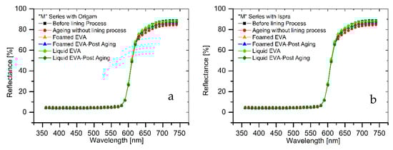 (a) Spectral reflectance curves acquired on “M” series specimens with Origam. (b) Spectral reflectance curves acquired on “M” series specimens with Ispra.