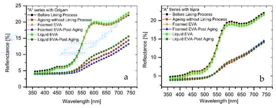(a) Spectral reflectance curves acquired on “A” series specimens with Origam; (b) spectral reflectance curves acquired on “A” series specimens with Ispra.