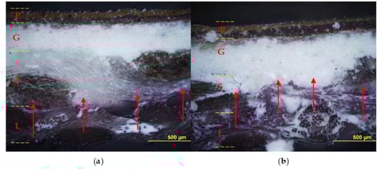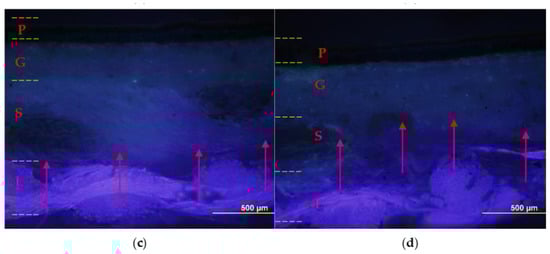Cross-sections: on the left sample lined with foamy adhesive, on the right sample lined with liquid adhesive. Optical microscope photographs in visible light (a,b) and UV light (c,d) with contrast marker applied: pictorial layer (P), ground layer (G), original canvas (S), and canvas lining (L). The EVA-based adhesive in foamed form (a,c) penetrated to the junction between the original canvas (S) and the lining canvas (L); instead, the adhesive without the foaming process (b,d) also penetrated the ground layer (G).