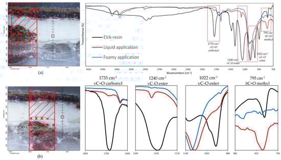 (On the left) FT-IR line maps on cross-sections: (a) foam EVA-based adhesive application, (b) liquid EVA-based adhesive application; painting layers (dots); preparatory layer (diagonal lines); original canvas (crosses); lining canvas (circles); measurement spots collected in the preparatory layers (red square). (On the right) FT-IR spectra on the measurement spots (red square); (blue line) foam EVA-based adhesive application; (red line) liquid EVA-based adhesive application. (Black line) EVA-resin standard. In the red spectrum, the vibrational bands related to the EVA-based resin characteristic C=O carbonyl (1735 cm−1), C-O ester (1240, 1022 cm−1), and C-H methyl (795 cm−1) functional groups are clearly visible.
