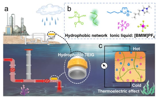 Interestingly, hydrophobic materials can eliminate the interference of water molecules effectively, owing to their low surface energy and moisture absorption, providing a possibility for realizing underwater stable application [27,28]. Inspired by this, in this work, we designed a delicate TEIG that is suitable for aquatic environments through one-step polymerization of hydrophobic monomer (Methyl methacrylate, MMA) in hydrophobic IL solvent (1-Butyl-3-methylimidazolium hexafluorophosphate, [BMIM]PF6). As we expected, the hydrophobic structure endows ionogel with excellent water resistance and stable underwater thermoelectric performance, remaining stable in both dry and underwater environments without ion leakage and gel swelling. Therefore, the water-resistant TEIG exhibits a profound potential in the field of harvesting low-grade heat energy in a submarine environment and rainy environment (Figure 1).