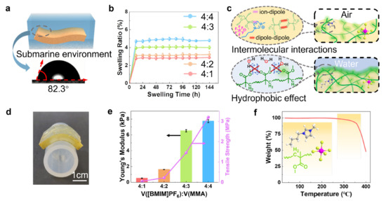 The hydrophobicity of these TEIGs was evaluated by contact angle test. As shown in Figure 2a and Figure S5, among them, the TEIG with a volume ratio of IL and MMA of 4:1 has the largest water contact angle of 82.3°, indicating that the hydrophobic IL plays a major role in improving the hydrophobicity of ionogel compared with hydrophobic polymers. This may be caused for two reasons, one is that IL possesses higher hydrophobicity due to the rich fluorine structure, and the other is that the IL occupies a larger proportion of the surface of ionogel as the continuous phase. The good hydrophobicity provides the basis for the long-term underwater stability of ionogel. These hydrophobic ionogels with different MMA contents were soaked into water for 6 days to study their underwater stability. Although a little swelling were observed in the beginning of the water soaking treatment, there were no remarkable weight changes for all ionogel samples in the subsequent 5 days (Figure 2b). The reason for these variation trends is that the sparse hydrophobic function groups on the ionogel’s surface start to gather under hydrophobic effect when contacting with water, resulting in lower surface free energy and higher underwater stability in the later period (Figure 2c). Meanwhile, the strong hydrophobic interactions and ion–dipole interaction between IL and polymeric network also restrain the loss of ions [32]. Consequently, the IL and MMA in a volume ratio of 4:1 showed the best antiswelling performance (swelling ratio: 2.8%) and underwater stability. The above results prove that the strategy of constructing hydrophobic structures by fully hydrophobic components is effective, with the hydrophobic network inhibiting the diffusion of H2O and ions effectively.