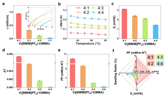 According to the definition of the thermal power Figure of merit (ZT), ionic conductivity (σ), thermal conductivity (λ), and ionic Seebeck coefficient (Si) are the key parameters that determine the energy conversion efficiency of thermoelectric materials. To optimize the ZT value of the TEIG, the thermoelectric parameters of four TEIGs with various MMA volume percentages were investigated and compared. Their ionic conductivity was measured by electrochemical impedance spectroscopy. As shown in Figure 3a, the ionic conductivity of the TEIG decreases with increasing MMA monomer content. It is generally accepted that ionic conduction is caused by the directional movement of free ions under an electric field. However, with more MMA monomer, the polymer network become denser, which reduces the space for free ion movement and reduces the conductivity. Therefore, the TEIG with an MMA volume ratio of 4:1 achieved the greatest ionic conductivity of 0.94 mS/cm among all samples. The thermal conductivities were measured by the laser flash method.