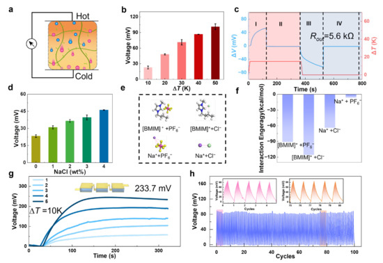 - Chen, B.; Chen, Q.; Xiao, S.; Feng, J.; Zhang, X.; Wang, T. Giant negative thermopower of ionic hydrogel by synergistic coordination and hydration interactions. Sci. Adv. 2021, 7, eabi7233. [Google Scholar] [CrossRef]