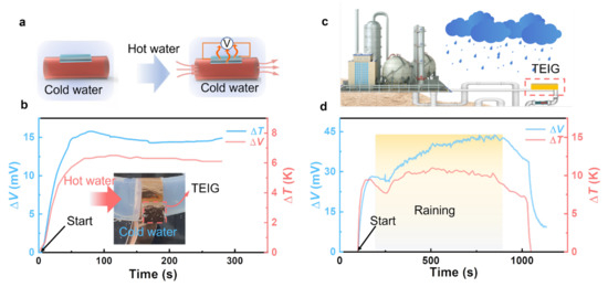 Demonstrations of ITEC harvesting waste energy in water environment: (a) Schematic of ITEC harvesting waste heat of industrial wastewater in underwater environment. (b) Variation of thermovoltage and temperature difference after hot water flowing into the pipe in water. (c) Schematic of ITEC operating in rainy environment. (d) Variation of thermovoltage and temperature difference in rain.