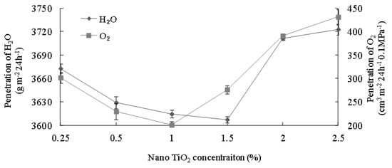 3.7. Effects of Nano-TiO2 on Water Vapor Transmission Rate and O2 Permeation